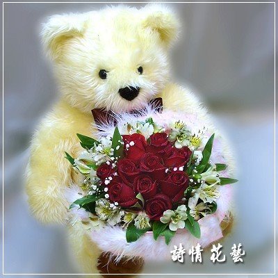 大泰迪熊+佳娜紅11朵玫瑰+水仙百合+滿天星+羽毛